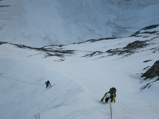 Wir sichern mit Eisschrauben, während es sich die nachfolgende Seilschaft an unserem Stand bequem macht.