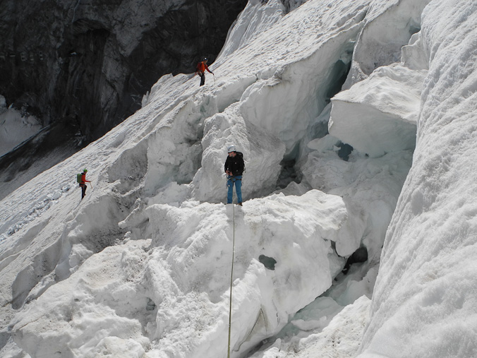 Wir erreichen über den zerschrundenen Gletscher die Mittellegihütte