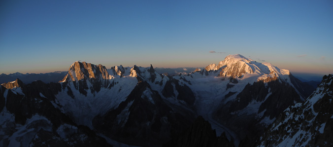 Der Rest läuft im Dunkeln ab. Grandes Jorasses und Mont Blanc im ersten Sonnenlicht