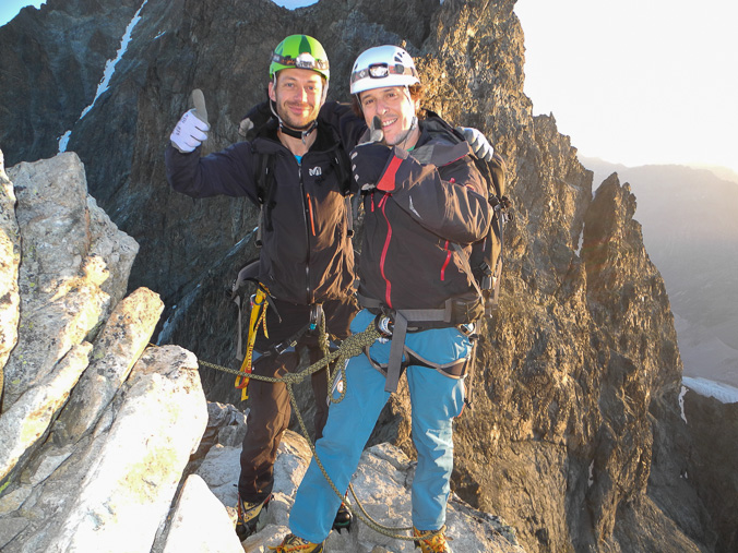 In der Fuorcla Prievlusa geht die Sonne auf. Beni und Mathias sind voller Tatendrang