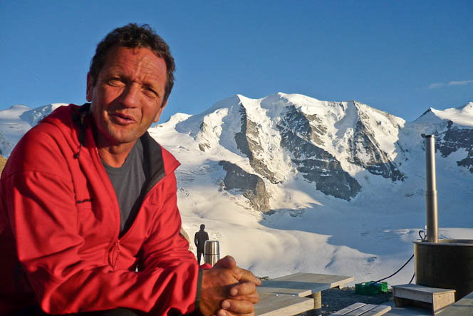 2.Tag Bellavista/Palü- Überschreitung: Jürg auf Sendung. Er moderiert die Wetterprognosen auf Tele Diavolezza