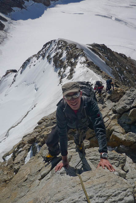 Deshalb müssen in der 2ten Hälfte der Tour die Felsen mit Steigeisen geklettert werden.